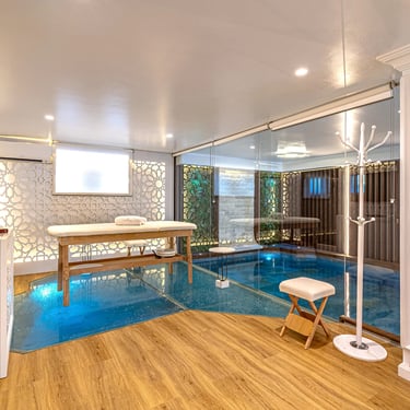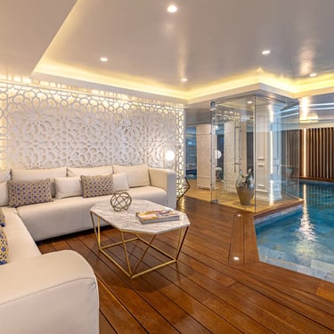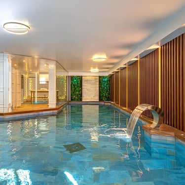 A fully renovated lower level with indoor heated pool, wellness area, gym, bar, TV lounge, and a soundproof disco, designed for both relaxation and private entertainment.