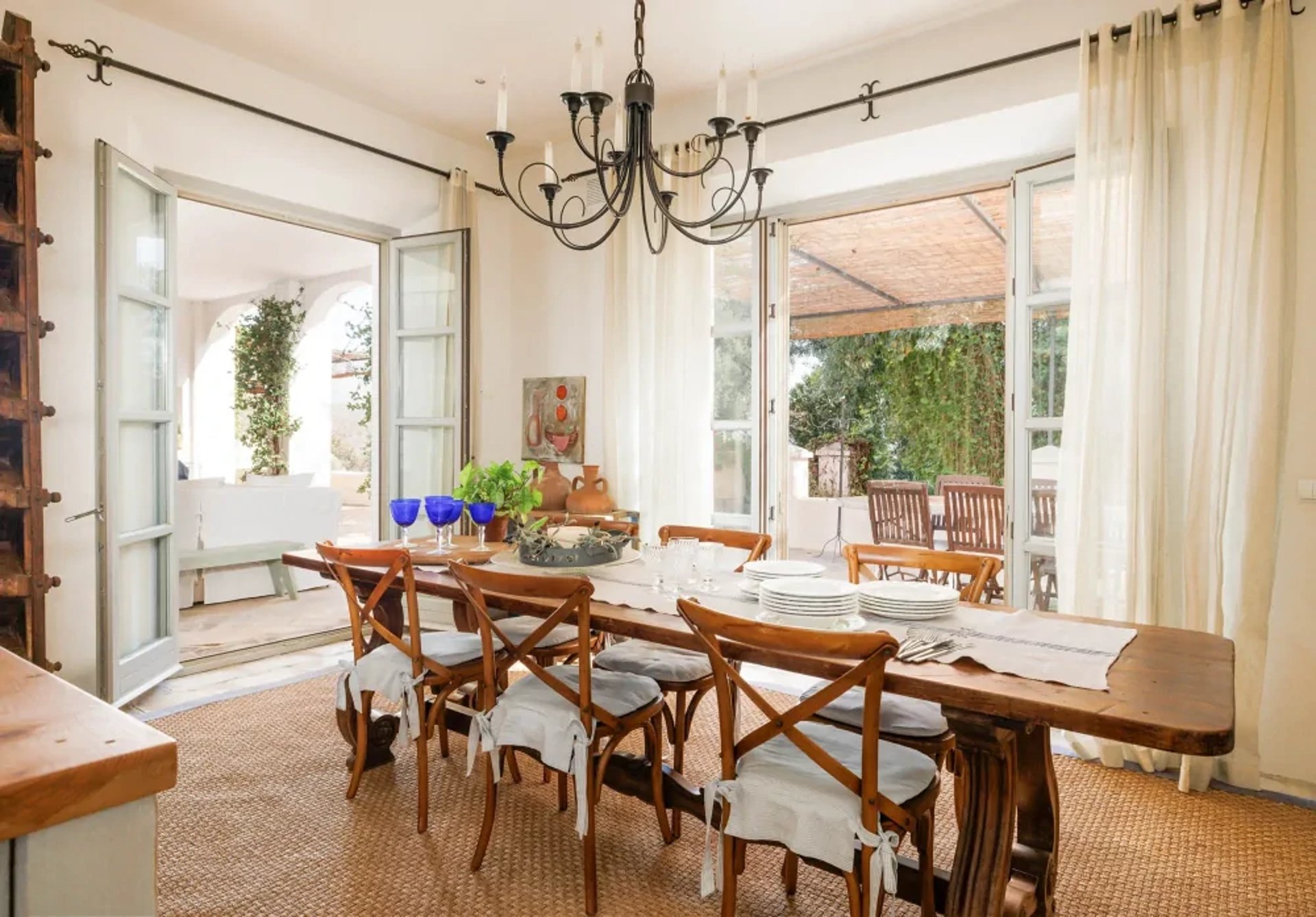 The kitchen at Finca Santa Katerina blends Andalusian charm with professional-grade function. Shuttered windows and French doors open to the terrace for seamless indoor-outdoor living, while a farmhouse table beneath an iron chandelier sets the scene for relaxed breakfasts or long dinners in true Andalusian style.