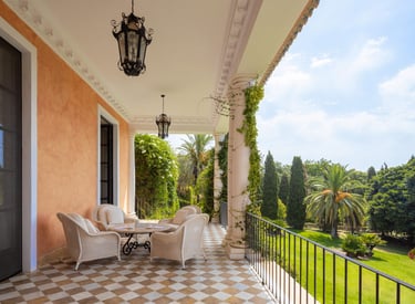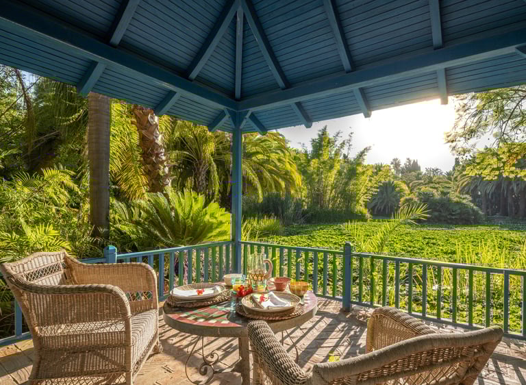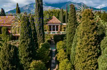 Villa El Cortijo is experienced path by path. Set within 35,000 m² of botanical gardens, the estate unfolds through palm groves, cypress corridors, fountains, and shaded courtyards, offering rare scale and presence for private stays and events in Marbella.