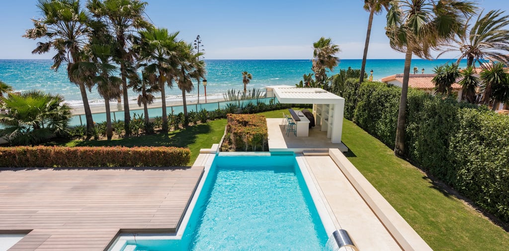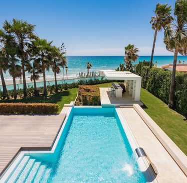 Villa La Farala is one of the most distinctive luxury villa rentals in Marbella, a contemporary six bedroom estate positioned directly on the Golden Mile beachfront. With panoramic Mediterranean views, private access to the promenade, and a calm residential setting between Puente Romano and Puerto Banus, the villa offers a combination of privacy, location, and design rarely found in Marbella villa rentals. Blending minimalistic interiors with soft Caribbean undertones, tropical gardens, and generous outdoor spaces, it represents a refined style of coastal living suited for families, retreat organisers, and small celebrations.