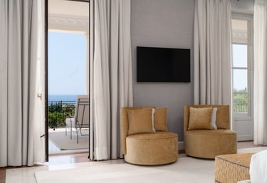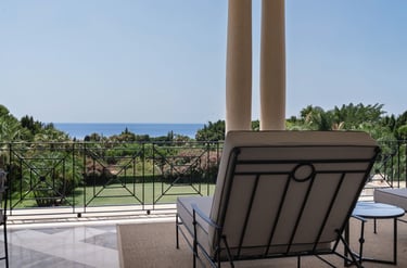 The upper floors feature the grandest suites, complete with spacious living areas, refined décor, and private terraces with superb Mediterranean views. Bathrooms include distinctive checkered floors, sculptural tubs, and large windows overlooking the gardens. One suite sits on the ground floor with easy access to the main salons, while two additional suites open directly to the outdoor pool level, offering privacy and independence. Dedicated service areas and storage rooms support smooth logistics for extended stays, staff teams, and high profile guests.