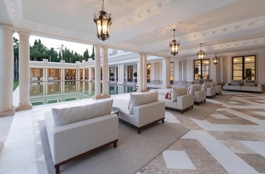 The estate’s scale supports large outdoor layouts, discreet operations, and seamless circulation for guests and production teams. Formal lounges, terraces, and quiet garden corners allow flexible setups for meetings, ceremonies, workshops, and private celebrations. The spa and indoor pool level adds space for wellbeing sessions and restorative breaks.