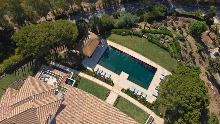 At the heart of the estate is a salt-treated swimming pool, a homage to the Finca Cortesin Hotel. Surrounded by travertine terraces, lawns, and vibrant landscaping, it reflects Andalusian tranquility with understated luxury.