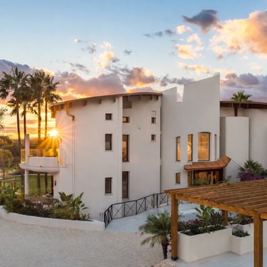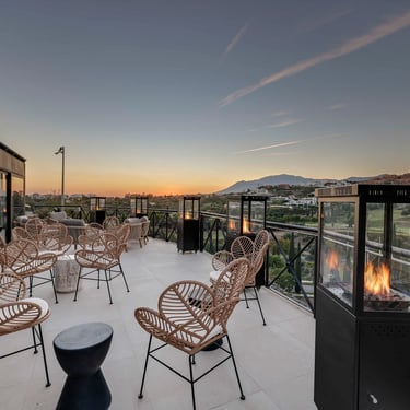 Elevated above golf landscapes near Villa Padierna, the villa enjoys long afternoon light and open views towards the Mediterranean and Gibraltar. Sunset backdrops frame terraces and pool areas within this distinctive Marbella setting.