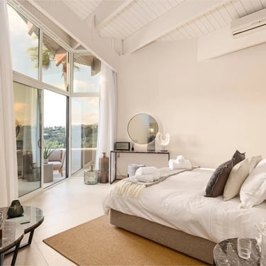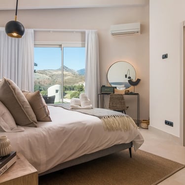 Fourteen en suite bedrooms are distributed across the main house and guest areas, offering flexible configurations for up to 34 guests. Many rooms enjoy sea or golf views, ensuring comfort, privacy and balanced group dynamics in Marbella.