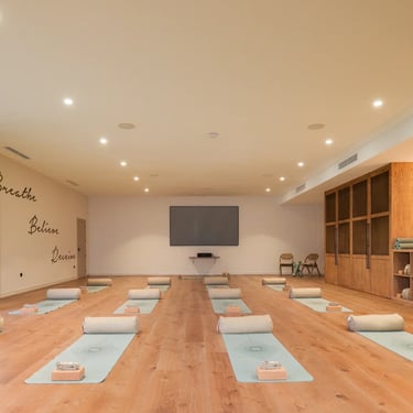Indoor and outdoor training zones include a rooftop spinning terrace, garden view gym and versatile yoga studio. The layout supports strength sessions, breathwork and instructor led programmes within a true fitness retreat environment.
