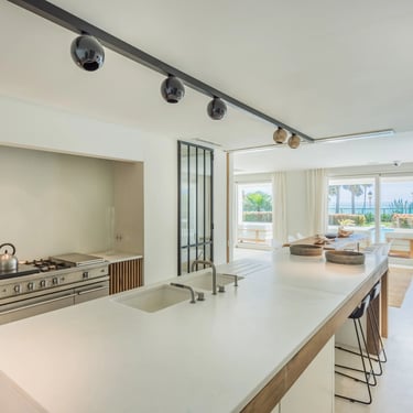 Soft neutral tones, natural textures, and expansive glazing create a light filled atmosphere. Interiors remain intentionally uncluttered, allowing sea views, sunlight, and landscaped gardens to shape the experience throughout the home.