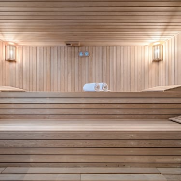 A full wellness floor includes a heated indoor pool, jacuzzi, sauna, massage suite, rain shower, and complete gym. This dedicated spa environment supports multi day retreats, recovery stays, and private wellbeing programmes within the estate.