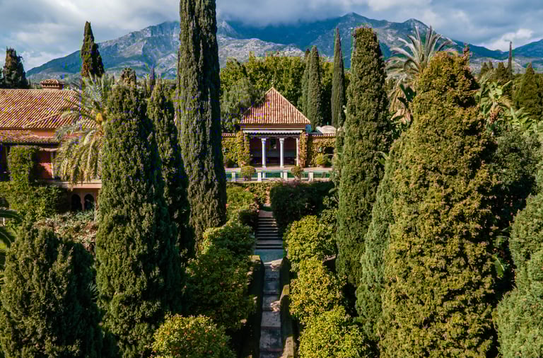 Villa El Cortijo is experienced path by path. Set within 35,000 m² of botanical gardens, the estate unfolds through palm groves, cypress corridors, fountains, and shaded courtyards, offering rare scale and presence for private stays and events in Marbella.