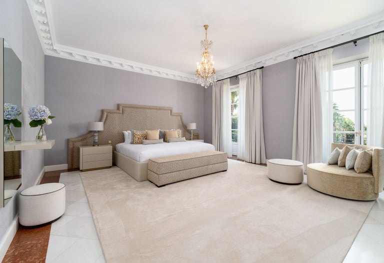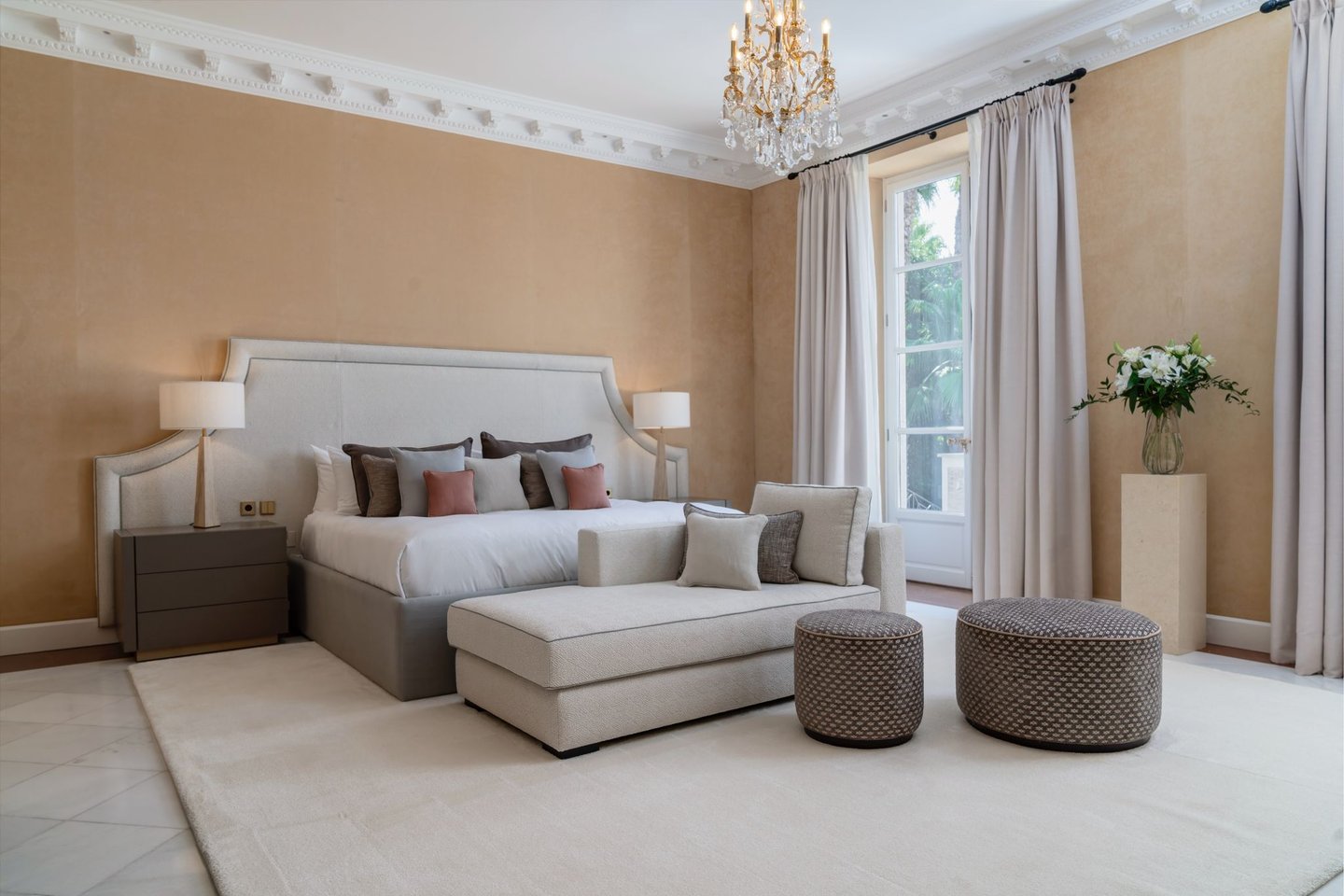 The upper floors feature the grandest suites, complete with spacious living areas, refined décor, and private terraces with superb Mediterranean views. Bathrooms include distinctive checkered floors, sculptural tubs, and large windows overlooking the gardens. One suite sits on the ground floor with easy access to the main salons, while two additional suites open directly to the outdoor pool level, offering privacy and independence. Dedicated service areas and storage rooms support smooth logistics for extended stays, staff teams, and high profile guests.