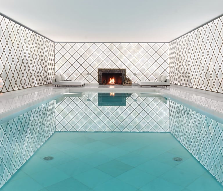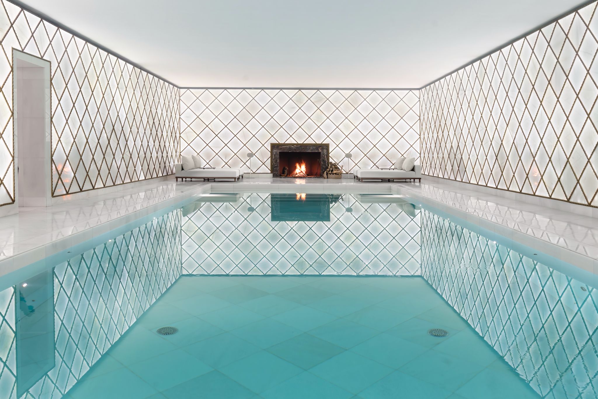 Dedicated spa level with heated indoor pool, jacuzzi, sauna, massage suite, and rain shower