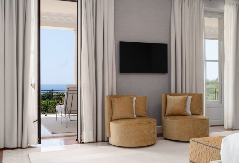 Eight refined suites for sixteen guests, including grand upper floor suites with sea view terraces
